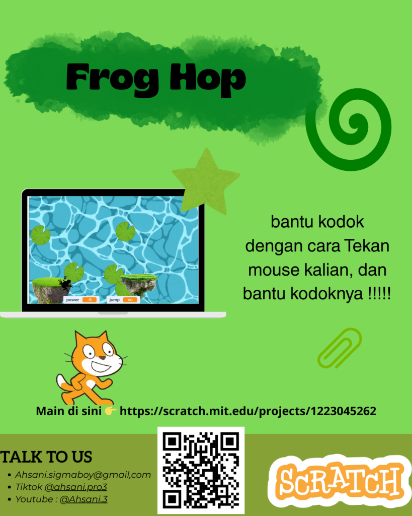 This Scratch project develops Frog Hop, an arcade-style jumping game where players guide a frog across obstacles and moving platforms. The game introduces timing, jump physics, collision detection, and simple level progression while improving focus and reaction speed.